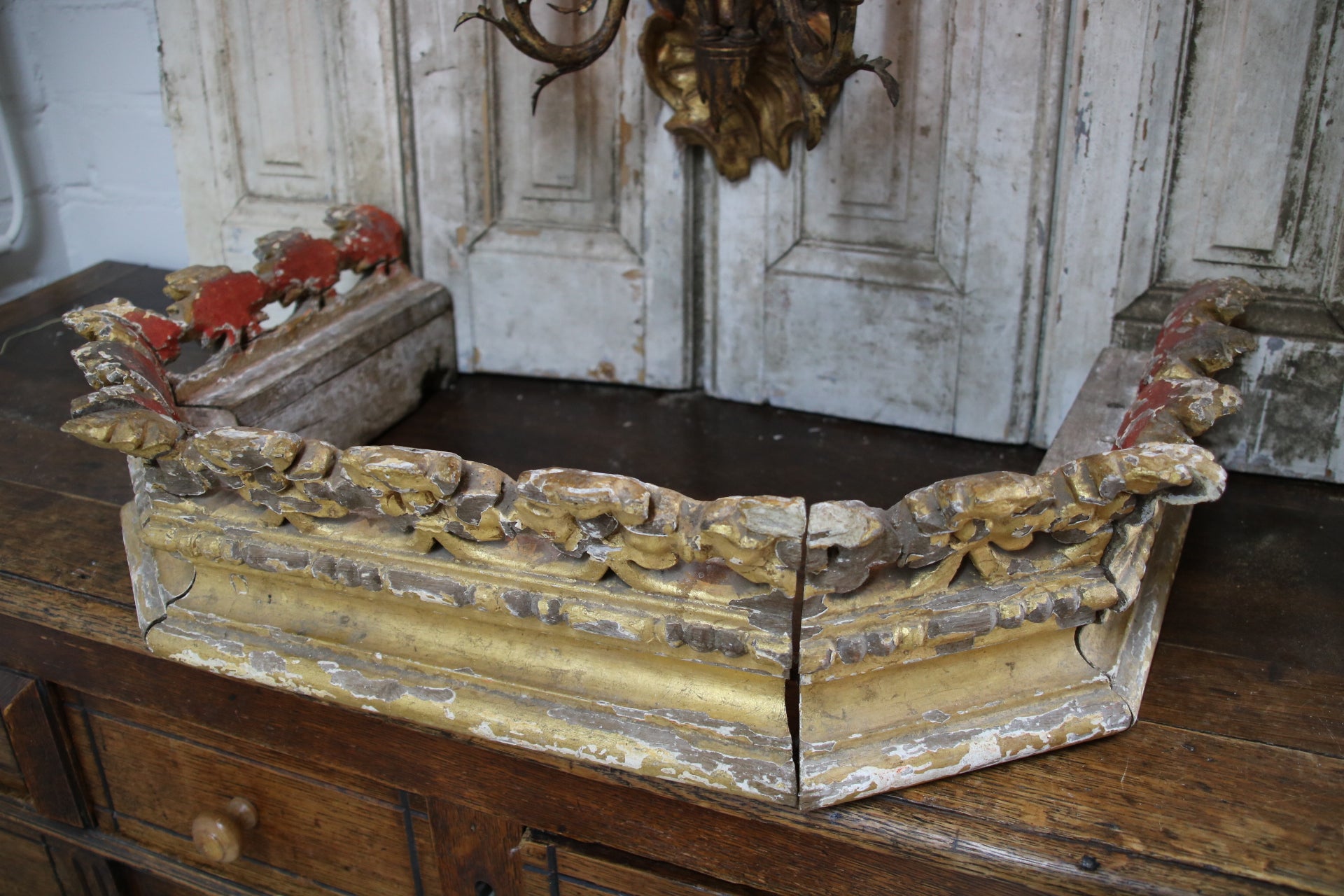Dit s is een antiek handgesneden houten ornament/voetstuk.