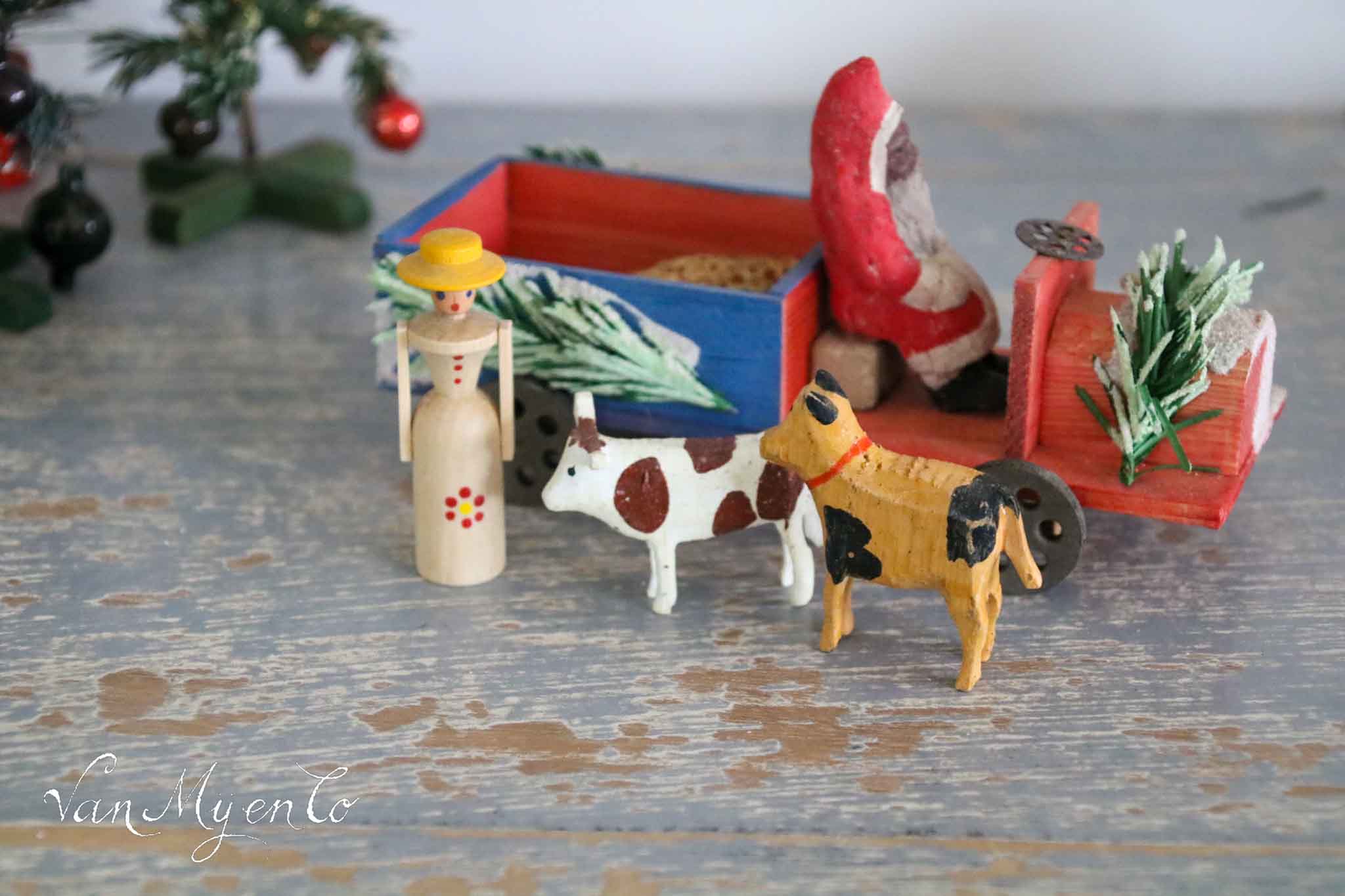 De diertjes en popje die in de bak van de auto zitten zijn van hout en zijn bij de prijs inbegrepen.