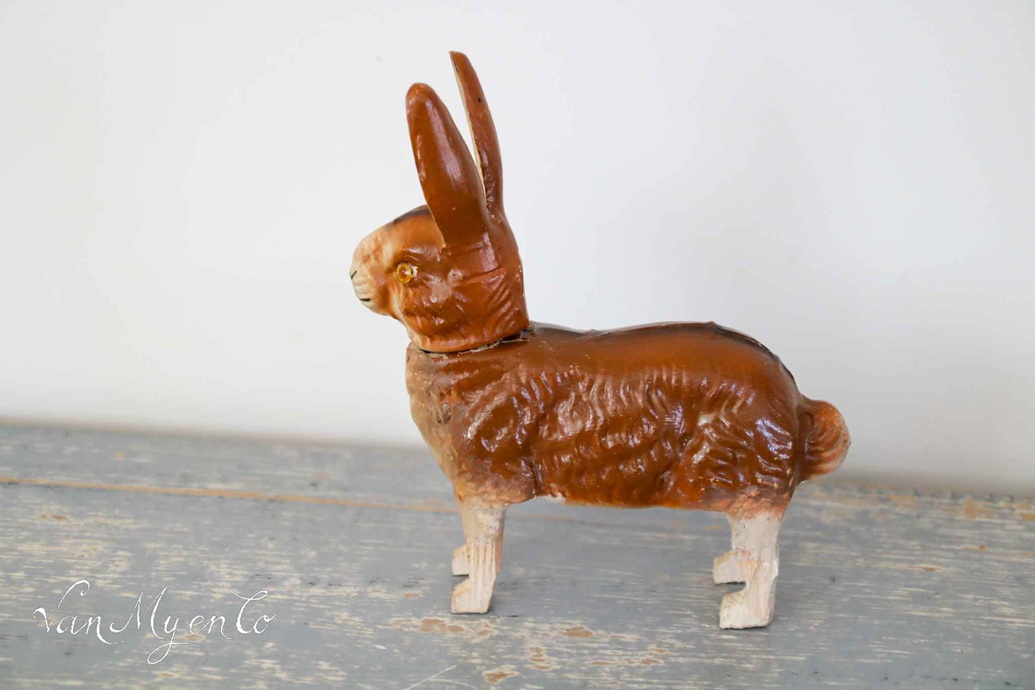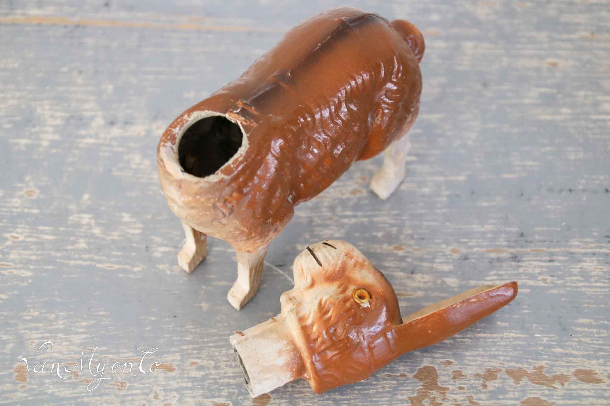 Mooie antieke candycontainer uit 1920-1930 van papier maché met houten pootjes en glazen ogen.