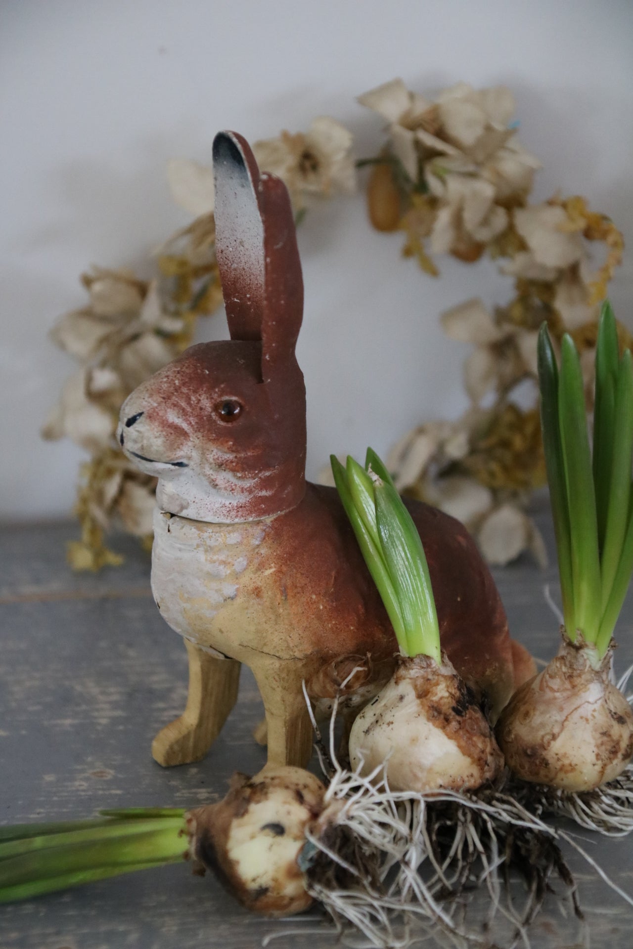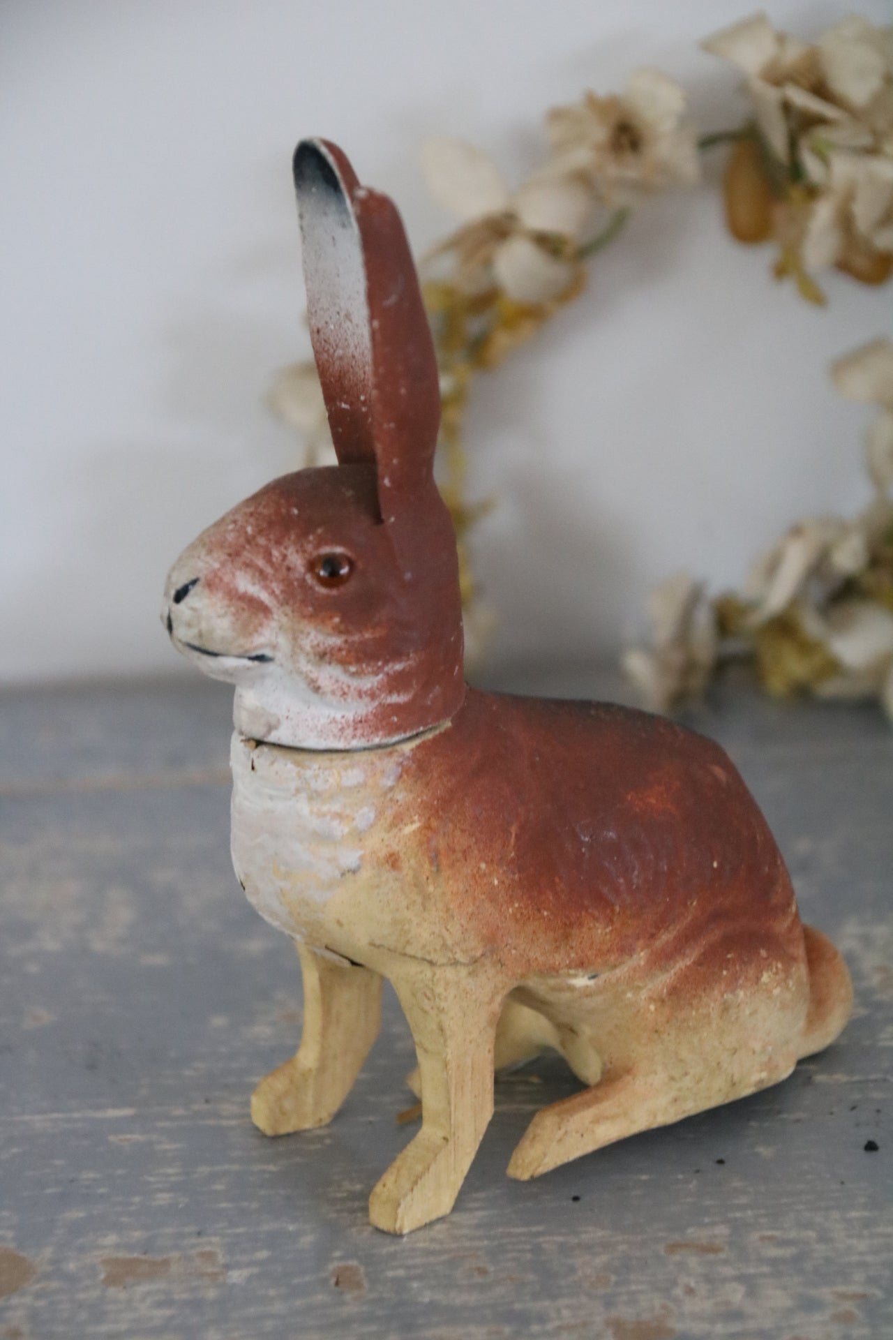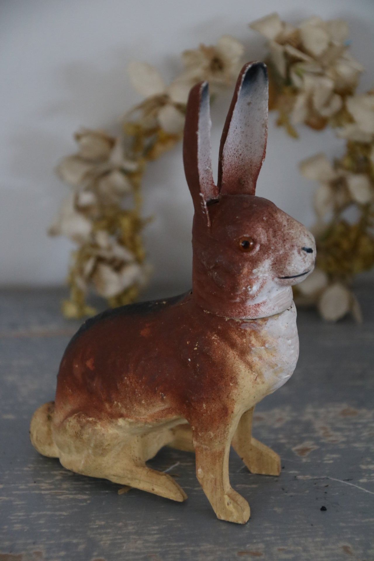 Antieke mooi afgewerkte paashaas candycontainer van papier maché. Deze mooierd heeft glazen ogen.