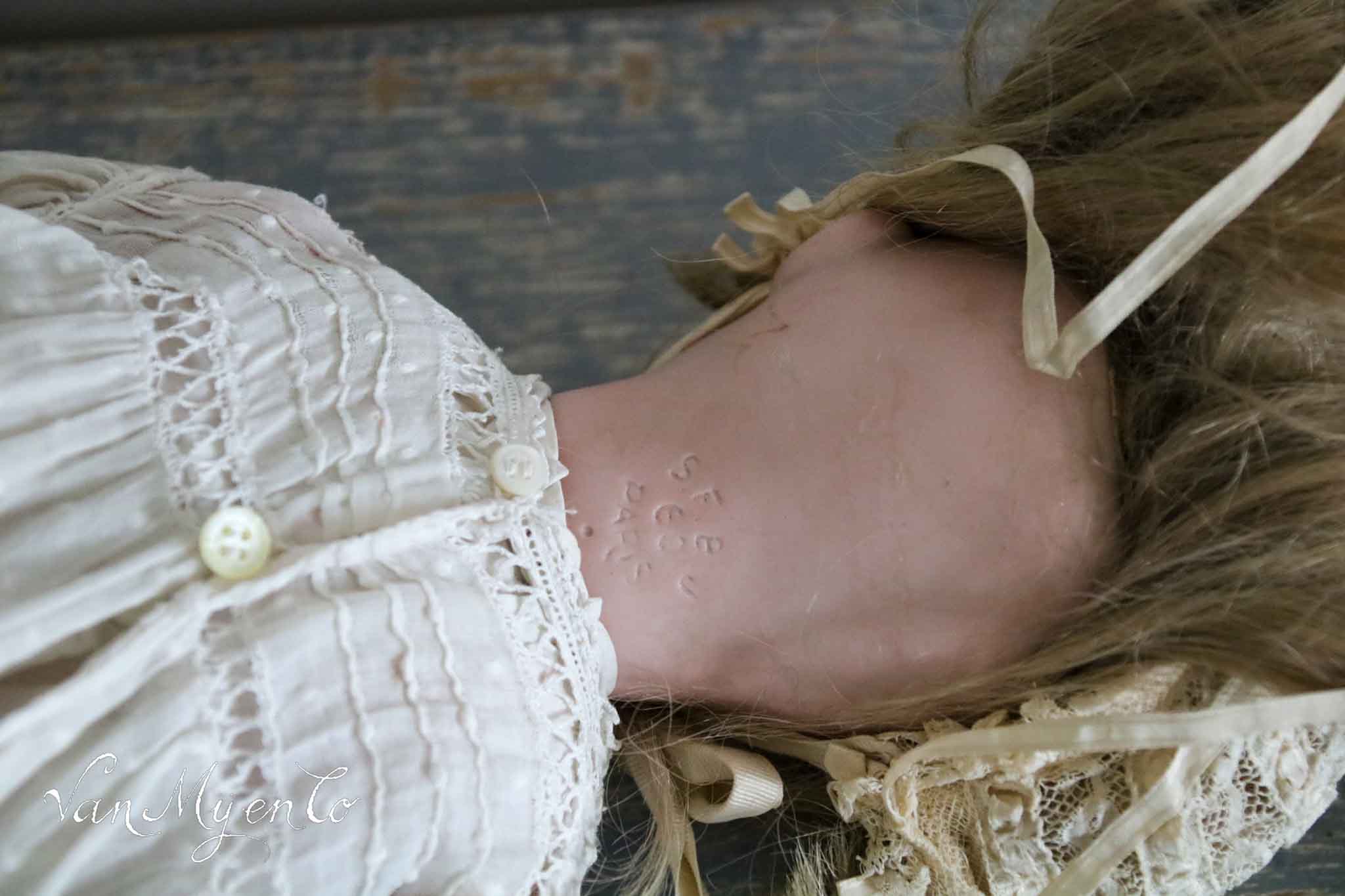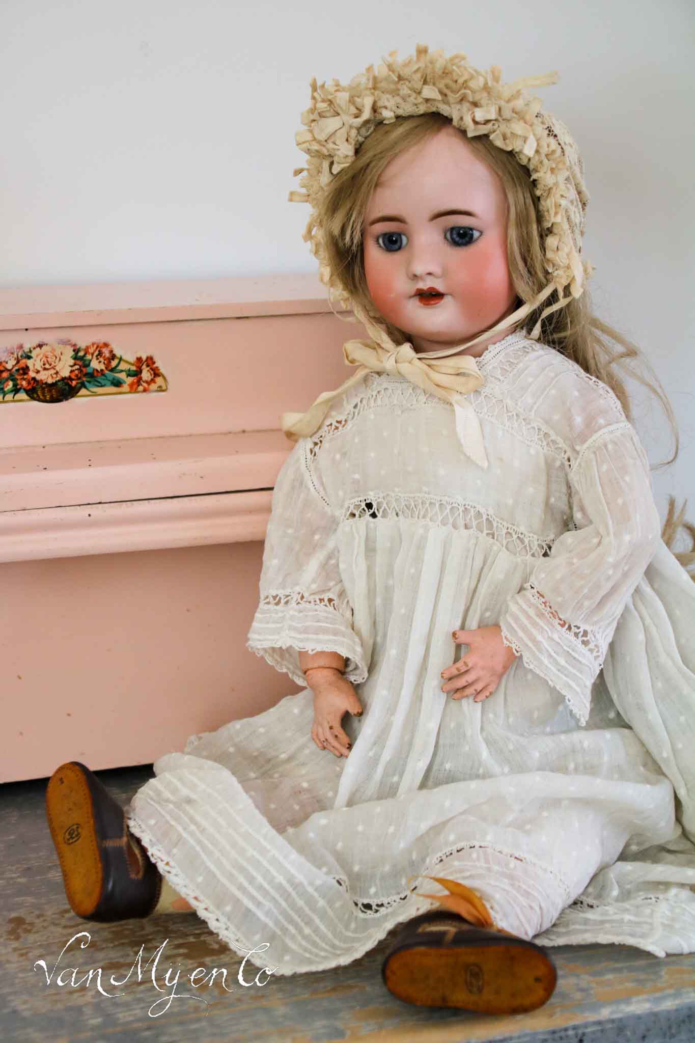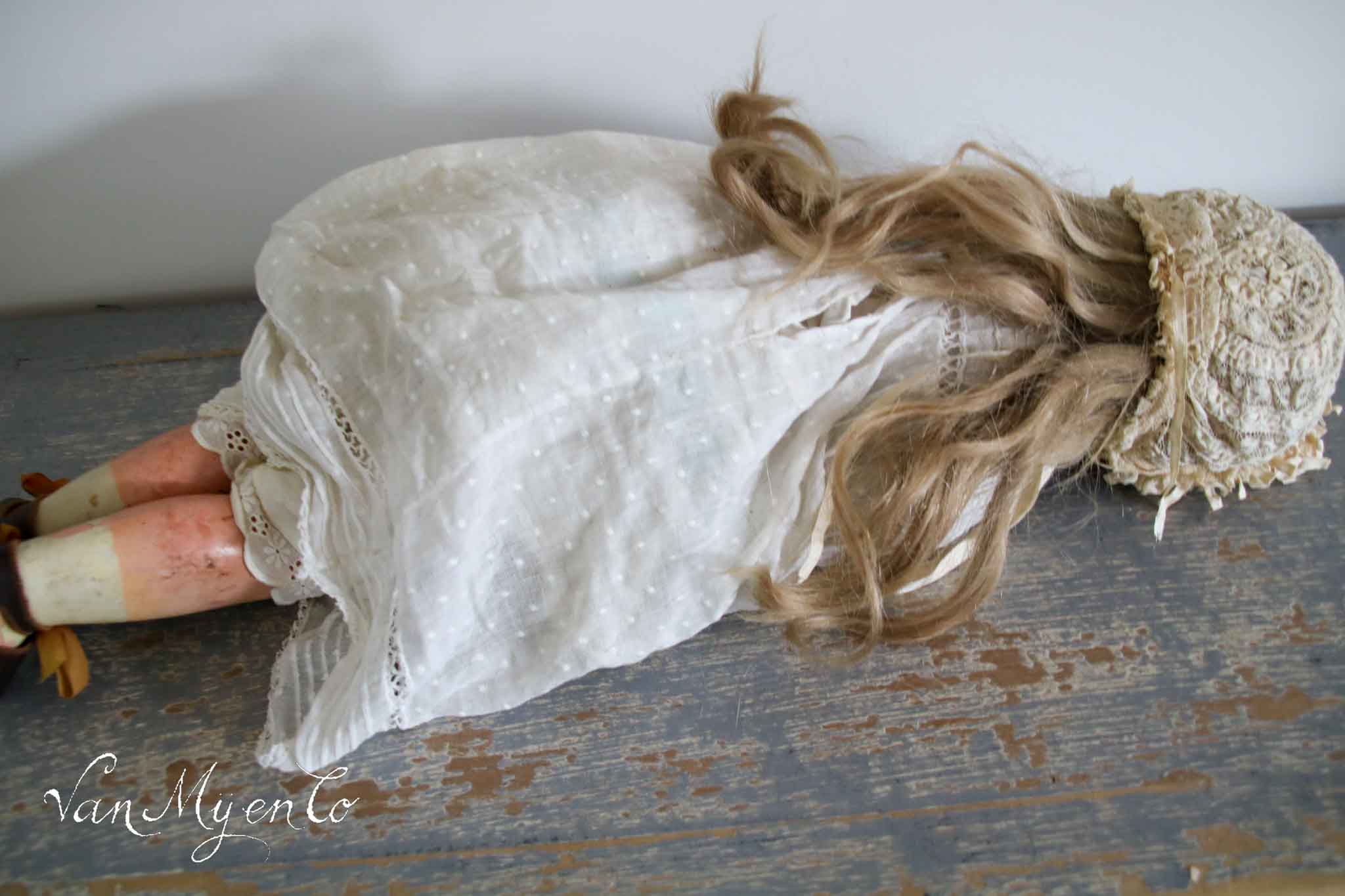 Sie trägt ein antikes Kleid und eine Mütze sowie einen alten Unterrock und Höschen.
