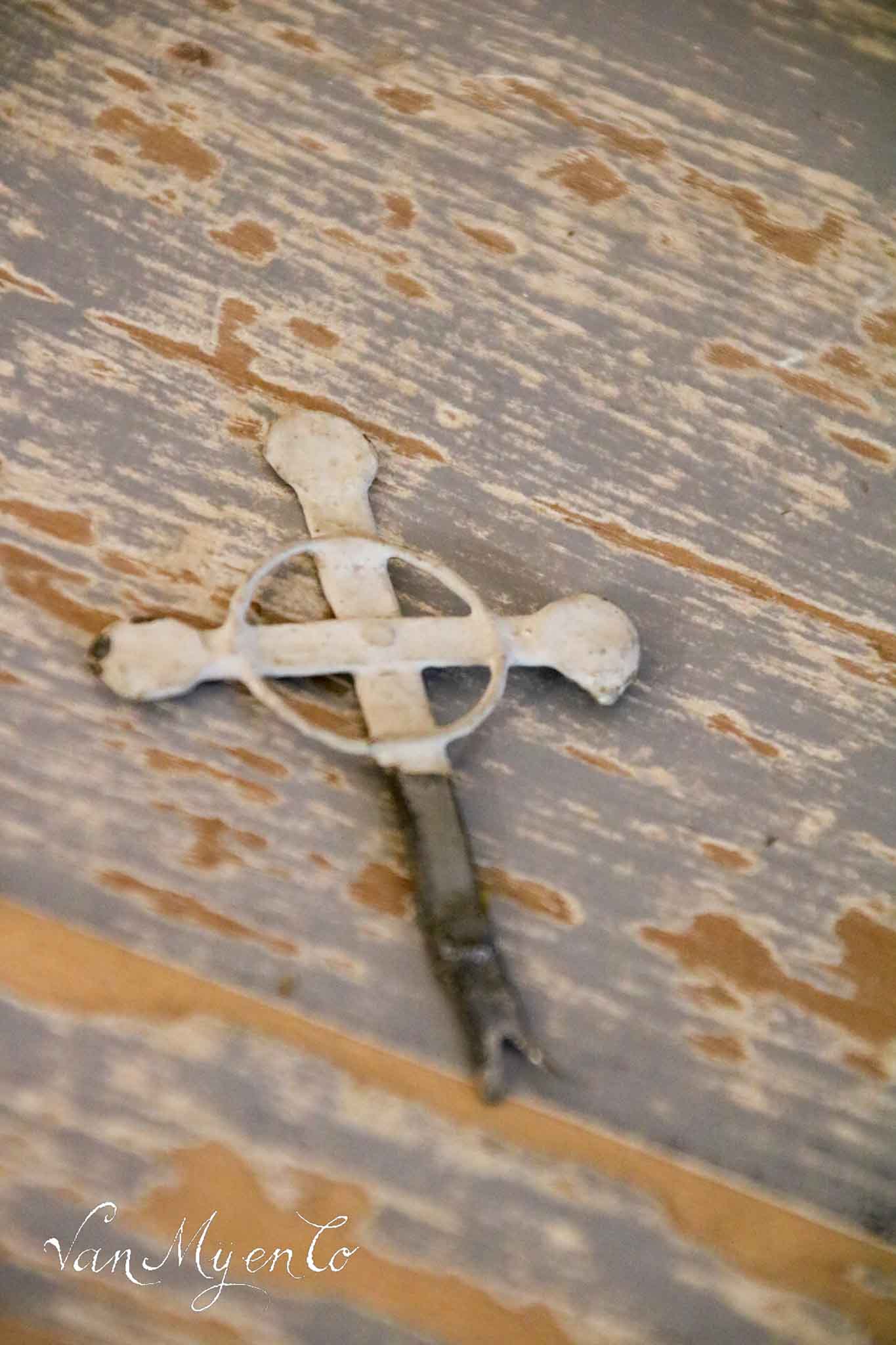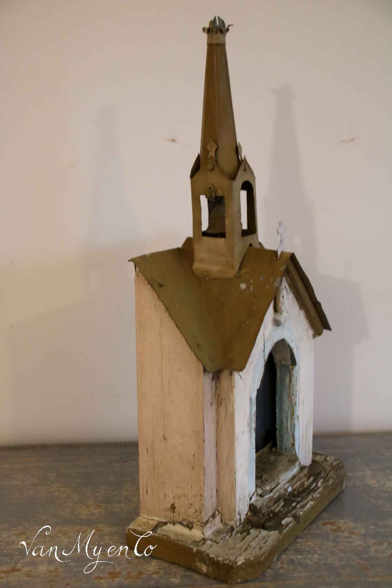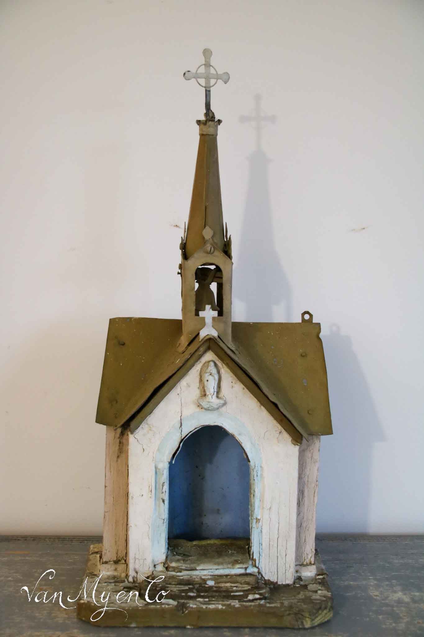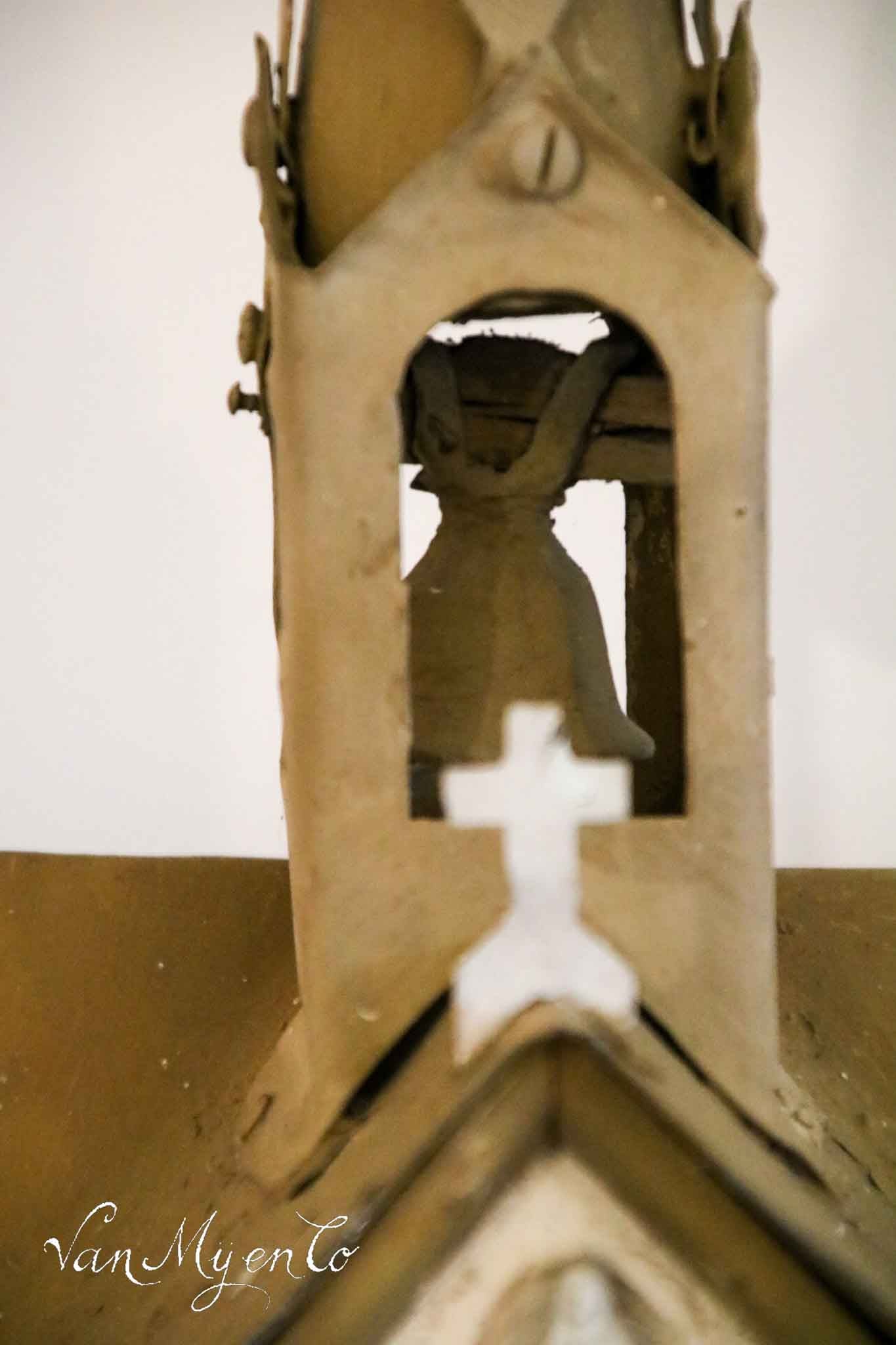 Das Kreuz auf der Spitze ist aus Metall, und im Turm hängt eine Glocke. Das Dach ist aus Zink.