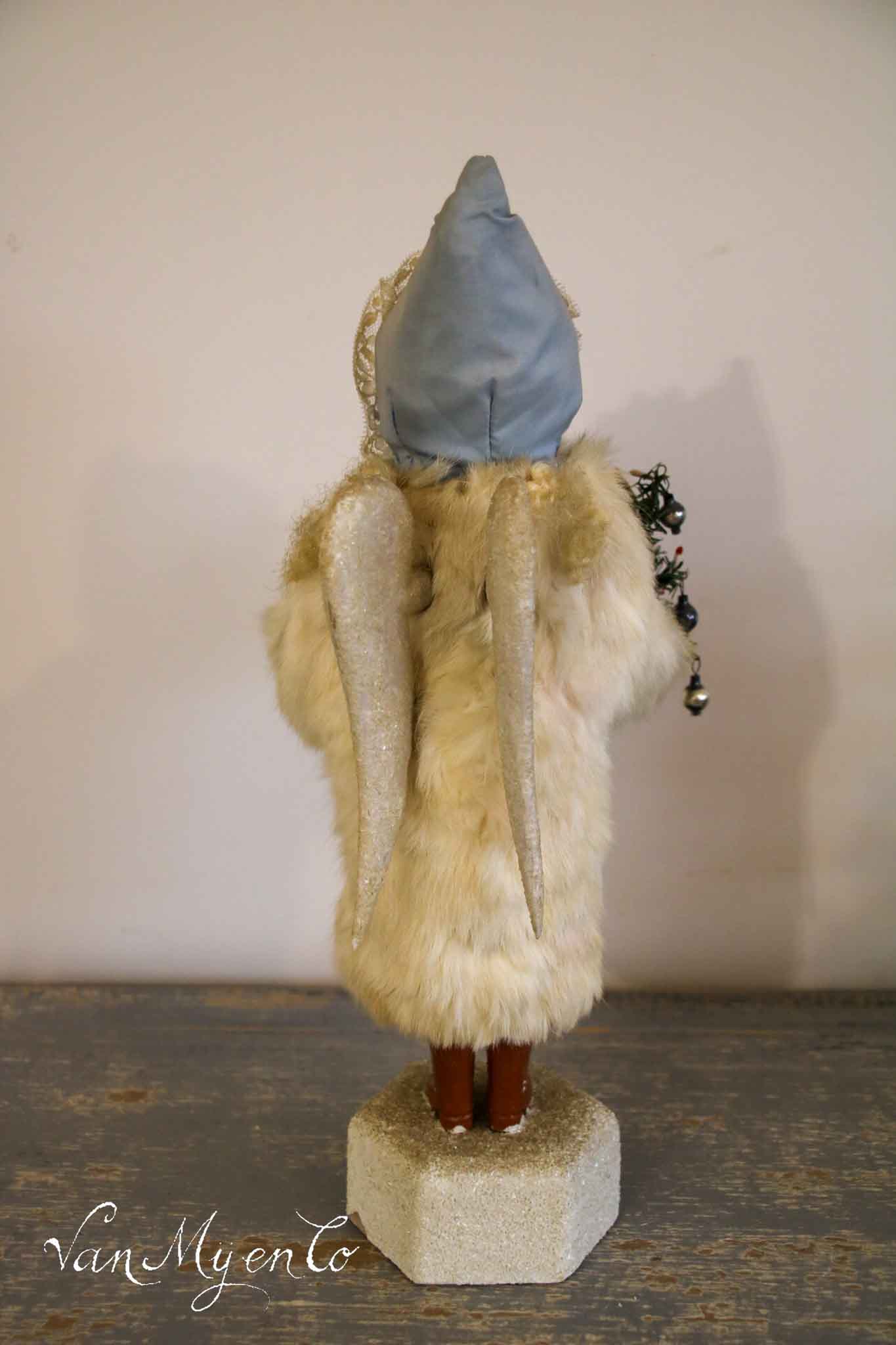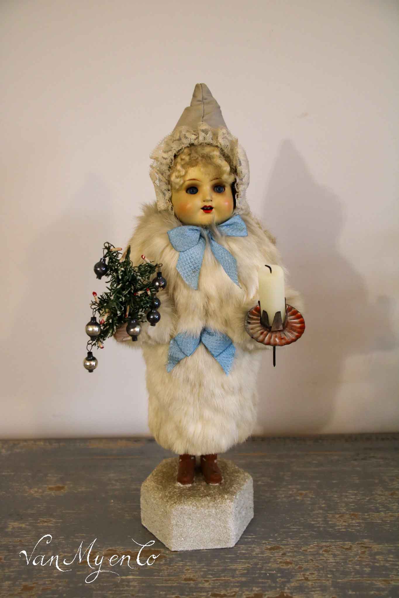 In ihrer rechten Hand trägt sie einen kleinen Baum mit Papiernadeln und 7 Glaskugeln.