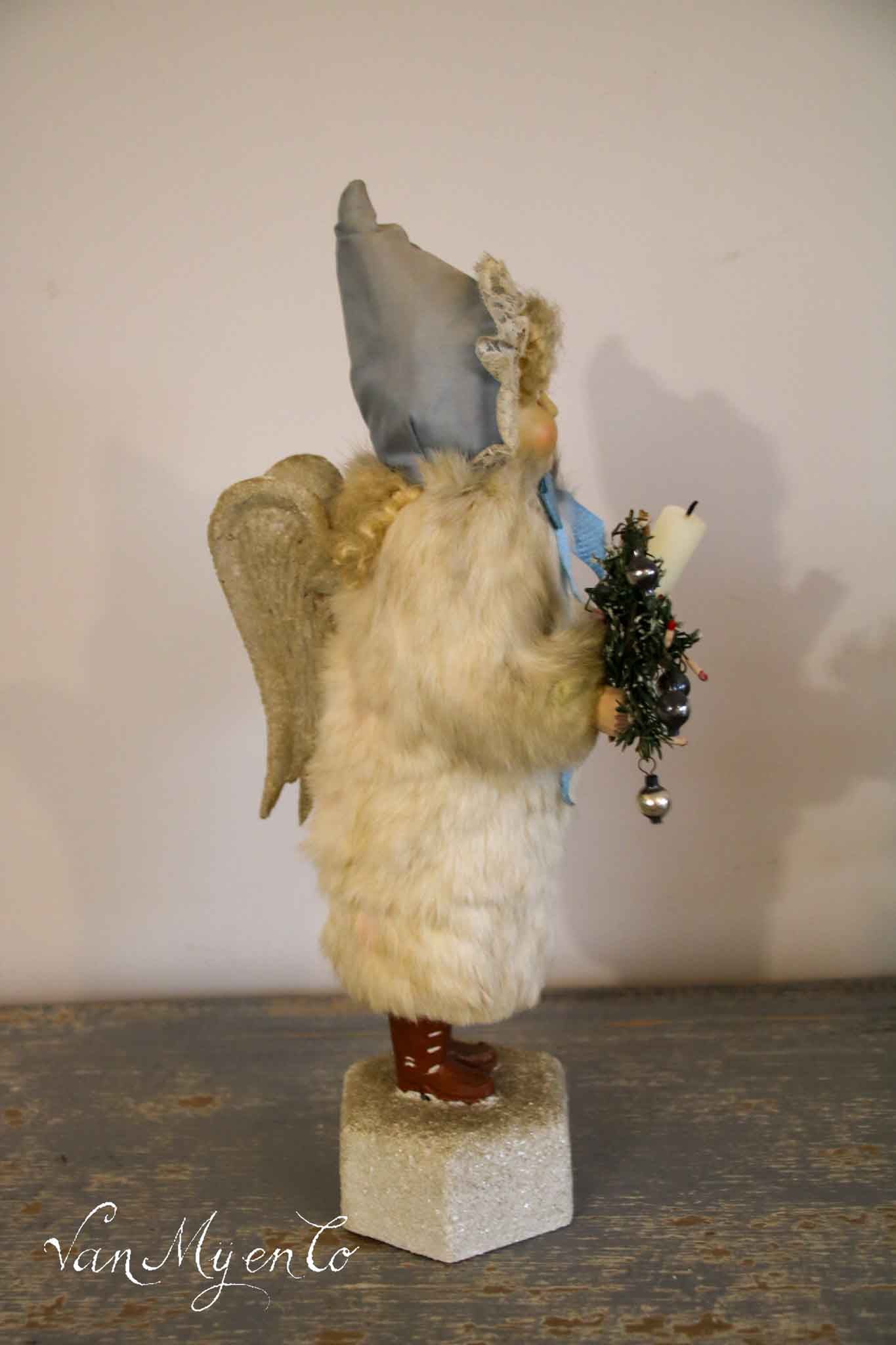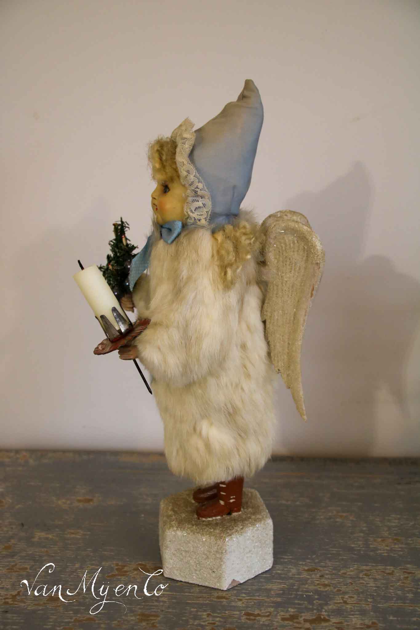 Wunderschöner, authentischer alter Lichtengel mit Holzsockel und Porzellankopf.