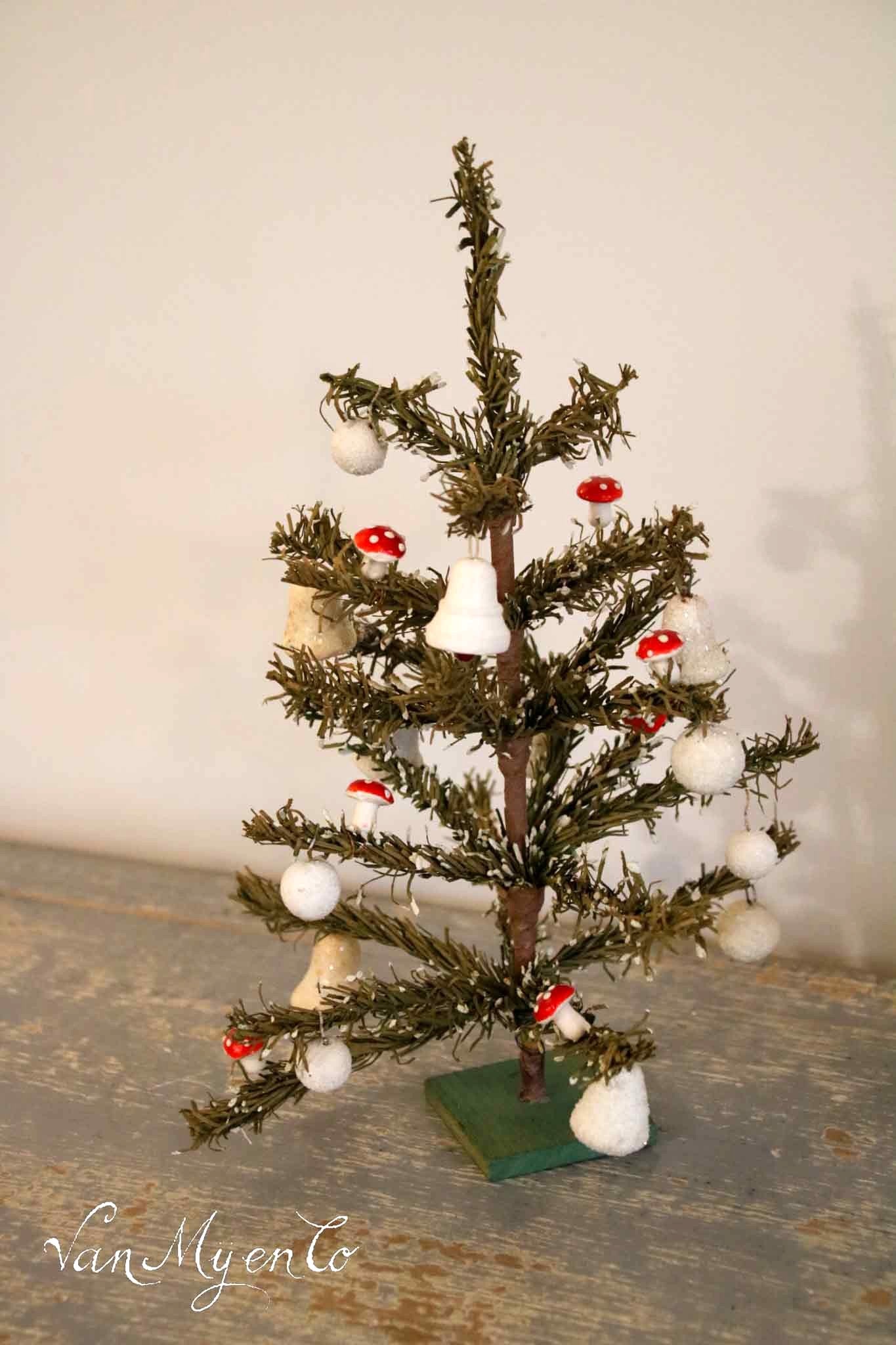 Ein wunderschöner, authentischer alter Weihnachtsbaum aus Papiernadeln und 22 Ornamenten aus gepresster Watte, die im Preis inbegriffen sind.