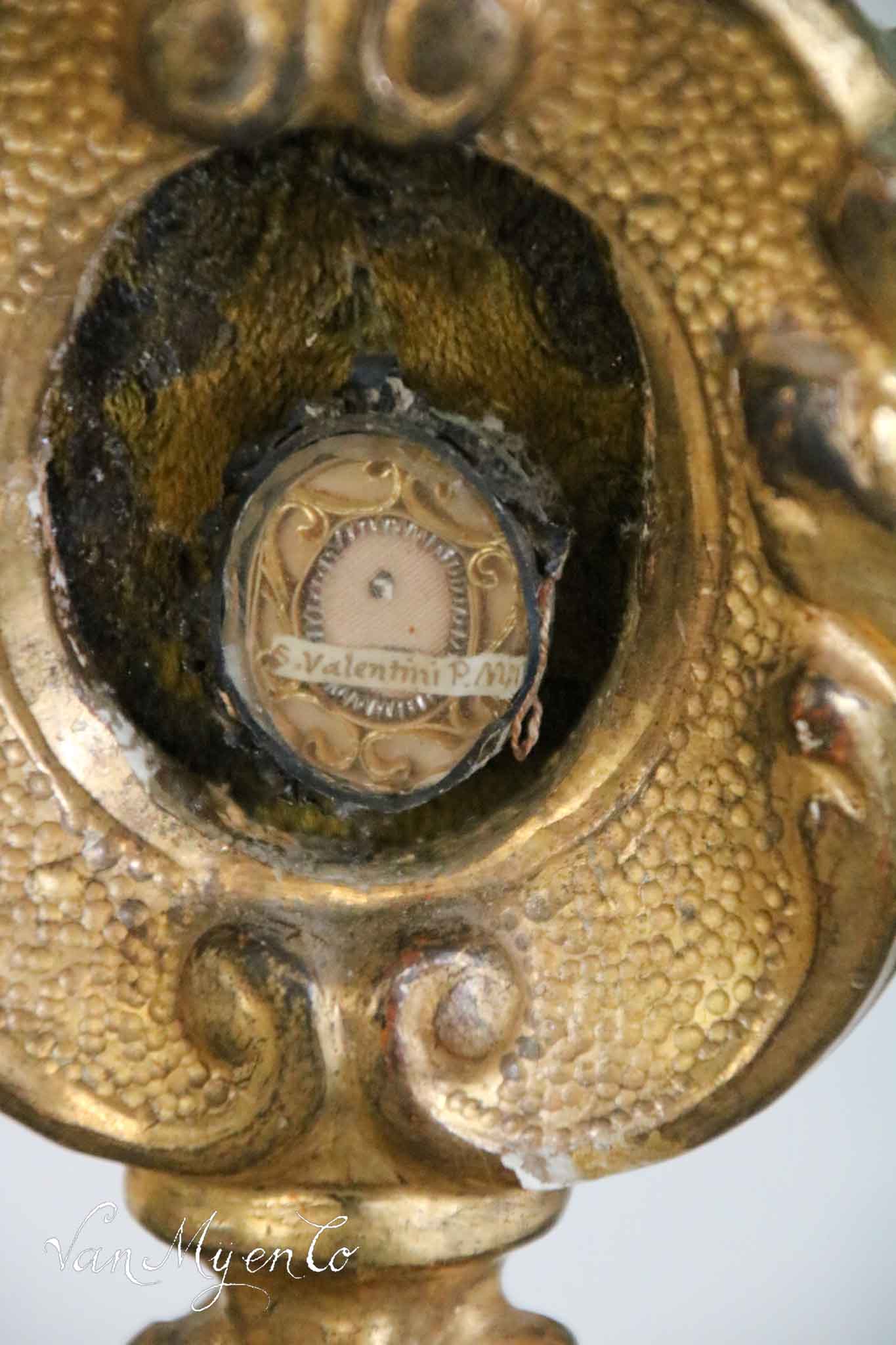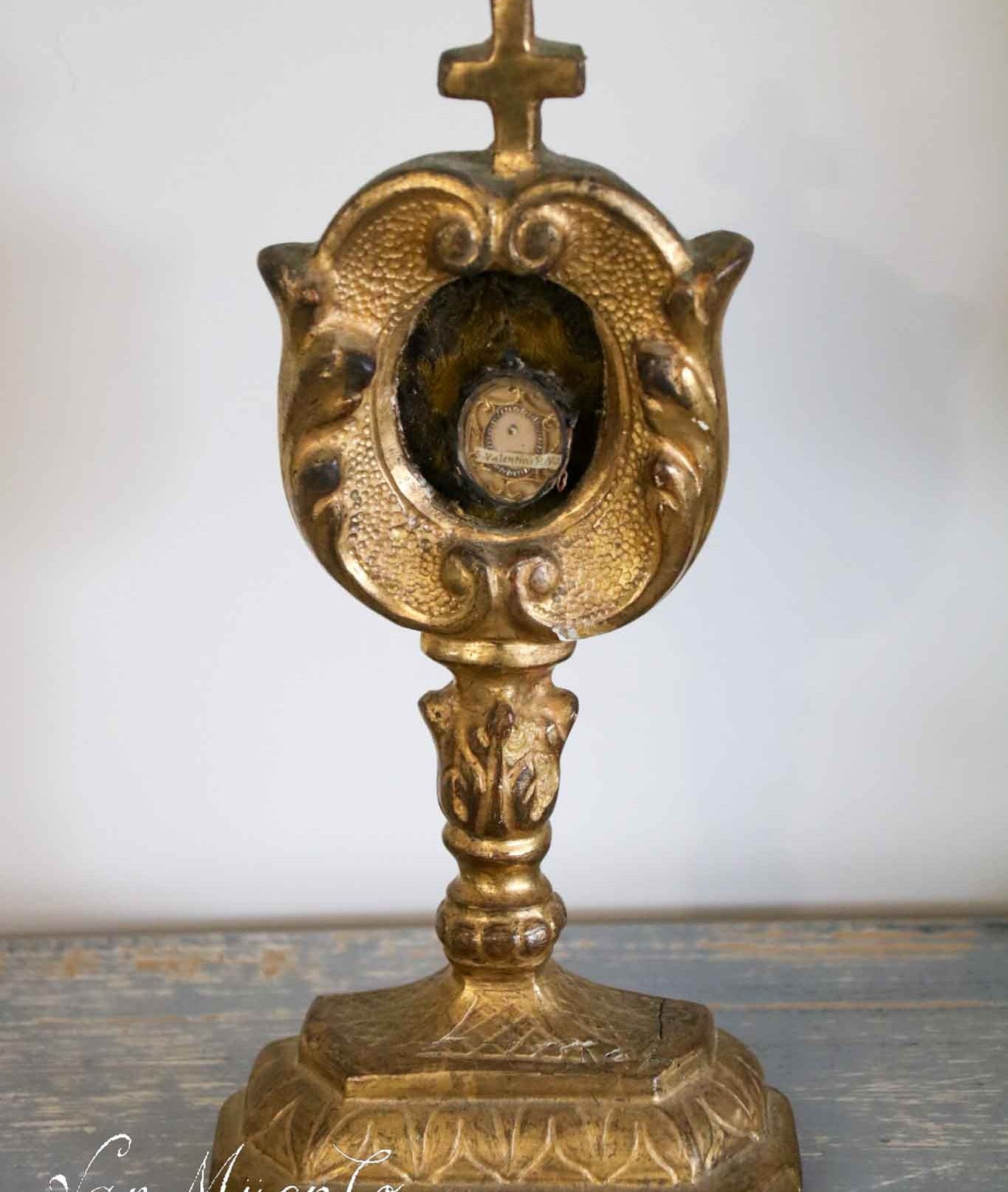 Wunderschön, dieses antike hölzerne Reliquiar aus vergoldetem Holz mit einer echten Reliquie.