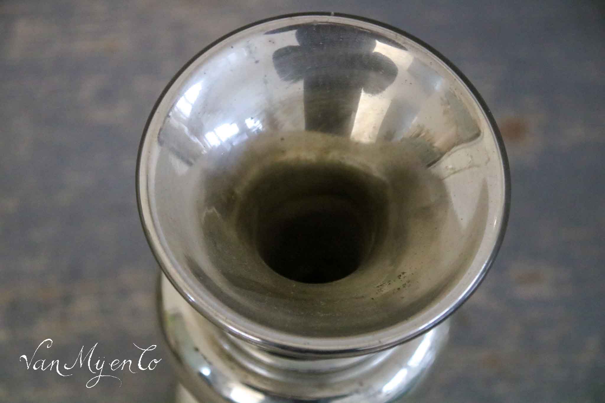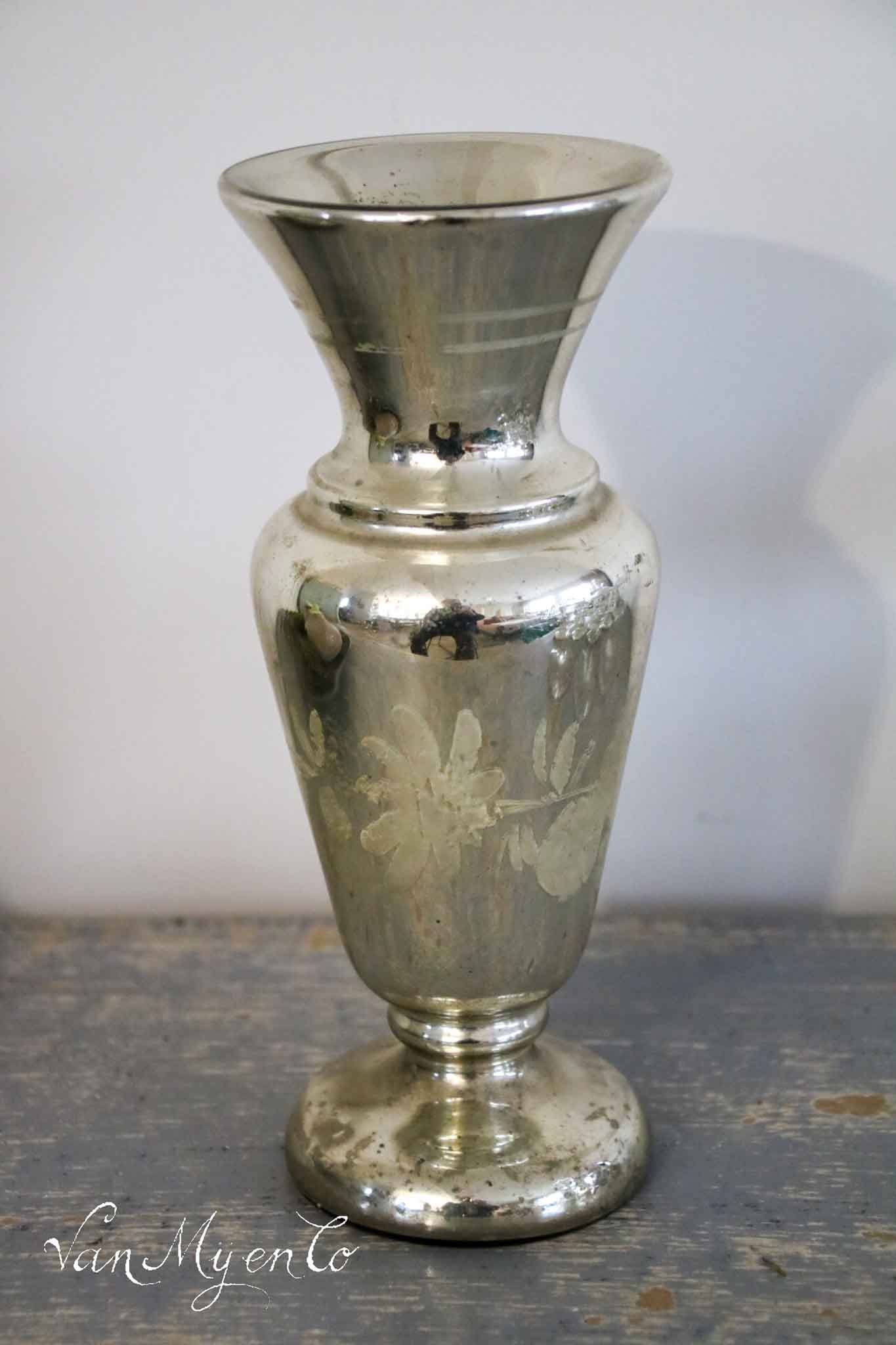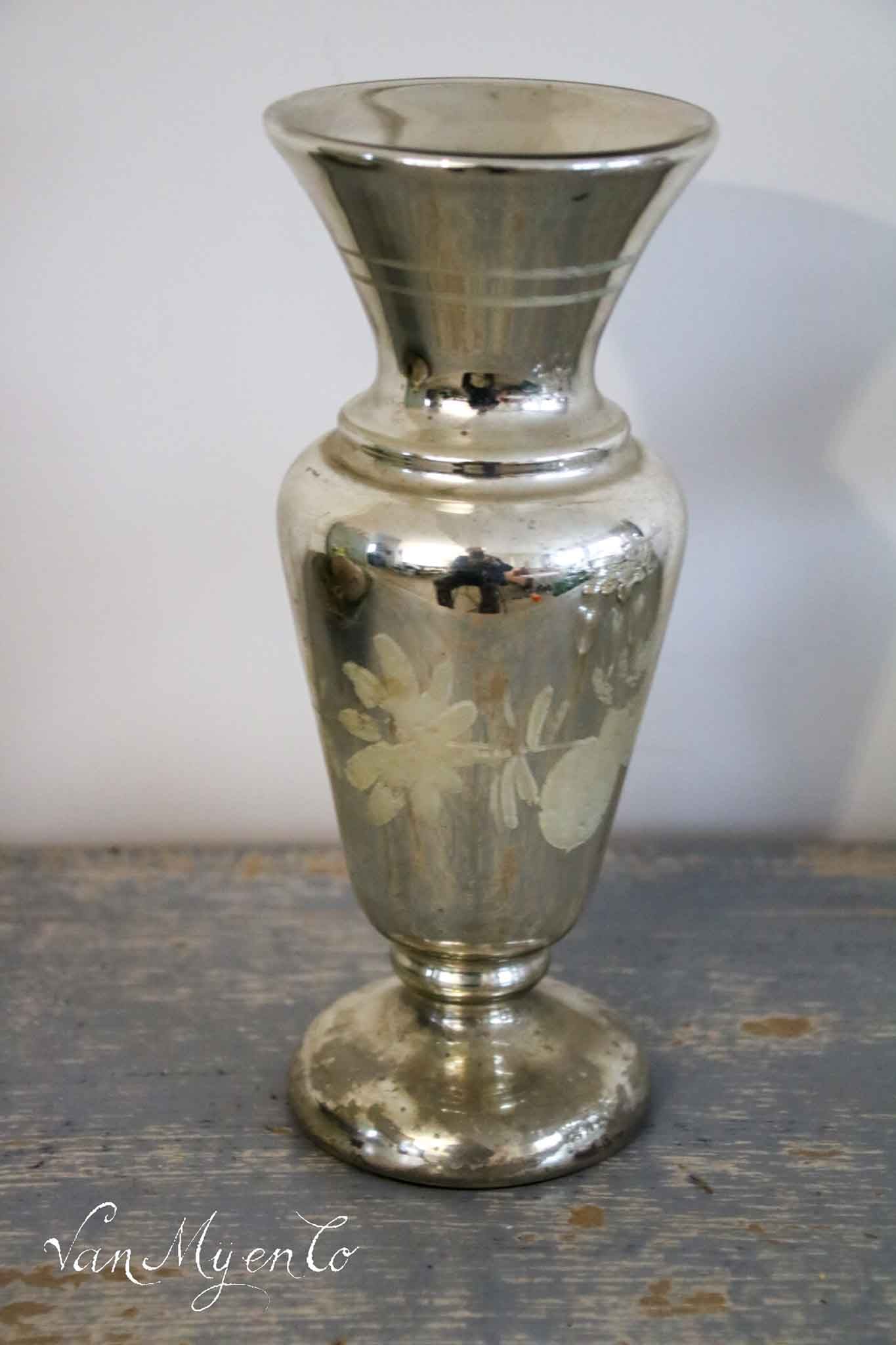Beautiful antique silver glass vase with white/gray decoration in the middle.